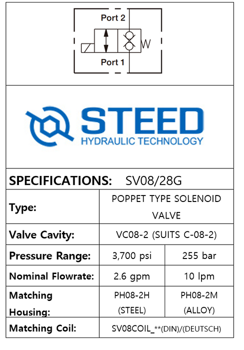 THIS ON/OFF 2 WAYS 2 POSITIONS SOLENOID VALVE USES A (SPOOL TYPE) SAE-08-2 CAVITY, WITH OPERATING PRESSURE UP TO 255 BAR AND A FLOW CAPACITY OF 19.0 LPM. WHEN DE-ENERGIZED, FLOW IS BLOCKED IN BOTH DIRECTION, REGARDLESS OF PRESSURE ON PORT 1 AND PORT 2. WHEN ENERGIZED, IT ALLOWS FLOW IN BOTH DIRECTIONS. BRAND: STEED.