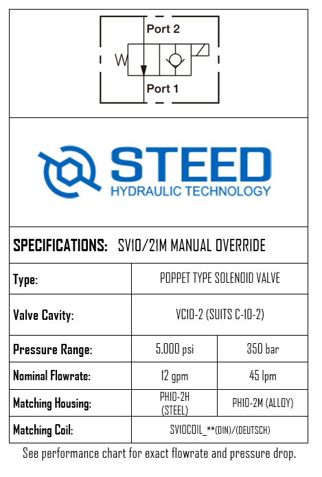 SV10/21M • SOLENOID VALVE 2 WAY 2 POSITION, NORMALLY OPEN • SAE-10-2 • 350 BAR • 57.0 LPM • STEED