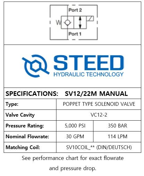 THIS ON/OFF 2-WAY 2-POSITION (MANUAL OVERRIDE) SOLENOID VALVE USES A SAE-12-2 CAVITY, WITH OPERATING PRESSURE UP TO 350 BAR AND A FLOW CAPACITY OF 114 LPM. WHEN SOLENOID COIL IS DE-ENERGIZED, THIS VALVE ALLOWS FLOW FROM PORT 1 TO 2 AND REVERSE FLOW FROM 2 TO 1 IS BLOCKED. WHEN SOLENOID COIL IS ENERGIZED, ALOWS FLOW BETWEEN PORTS 2 AND 1 AND REVERSE. BRAND: STEED.