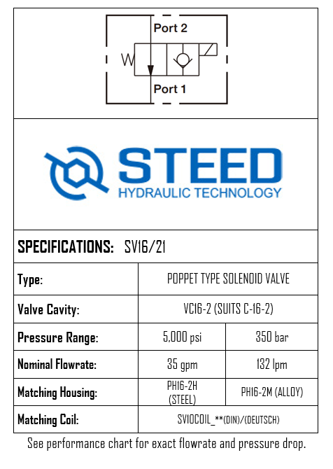 THIS ON/OFF 2-WAY 2-POSITION SOLENOID VALVE USES A SAE-16-2 CAVITY, WITH OPERATING PRESSURE UP TO 350 BAR AND A FLOW CAPACITY OF 132 LPM. WHEN DE-ENERGIZED, IT ALLOWS FLOW FROM 2 TO 1. FLOW FROM 1 TO 2 IS SEVERELY RESTRICTED. WHEN ENERGIZED, THE VALVES POPPET CLOSES ON ITS SEAT, BLOCKING FLOW FROM 2 TO 1. THE CARTRIDGE WILL ALLOW 1 TO 2 FLOW AFTER OVERCOMING THE SOLENOID FORCE. BRAND: STEED.