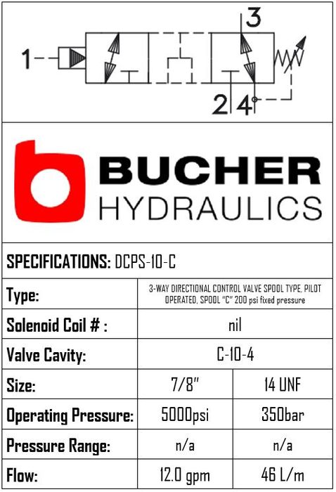 THIS PILOT OPERATED 3-WAY SPOOL C TYPE VALVE USES A C-10-4 CAVITY, OPERATES TO 350 BAR, AND FLOWS 46 LPM. BRAND: BUCHER HYDRAULICS.