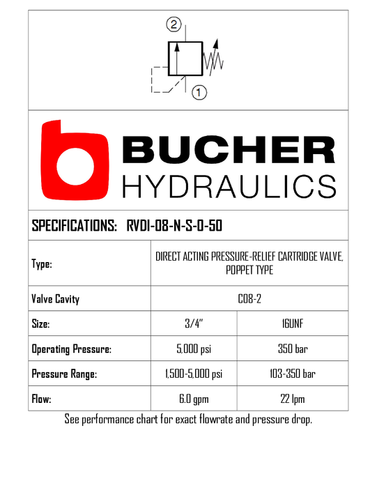 RVDI-08-N-S-0-50 • RELIEF VALVE • DIRECT ACTING • POPPET TYPE • C-8-2 • 350 BAR (SET 105–345 BAR) • 22 L/MIN • BUCHER