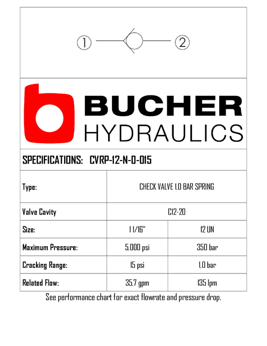 CVRP-12-N-0-015 • CHECK VALVE REVERSE GUIDED POPPET • 1 BAR • C-12-2 • 350 BAR • 136 LPM • BUCHER