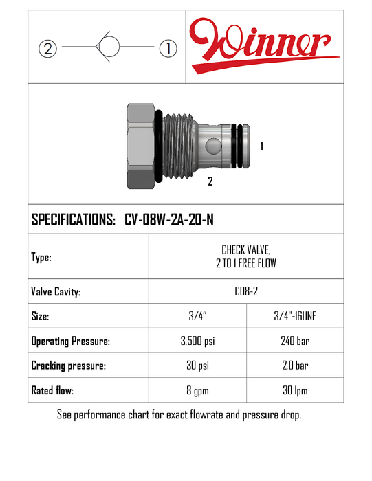 CV08W2A20N • CHECK VALVE 2 TO 1 FREE FLOW • 2.0 BAR • C-08-2 • 240 BAR • 30 LPM • WINNER