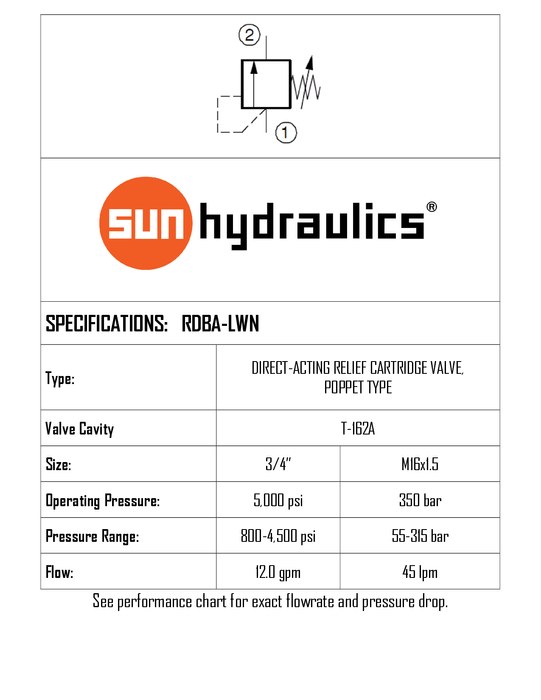 DETAILS: T-162A CAVITY • 3/4"-16 UNF • BUNA-N SEALS • SCREW ADJUSTMENT • STANDARD MATERIAL/COATING • PRESSURE RANGE 55–315 BAR (800–4500 PSI) • FACTORY SET 70 BAR (1000 PSI) • MAX PRESSURE 350 BAR (5000 PSI) • FLOW 45 L/MIN • DIRECT ACTING PRESSURE RELIEF VALVE • BRAND: SUN HYDRAULICS rdba-lwn