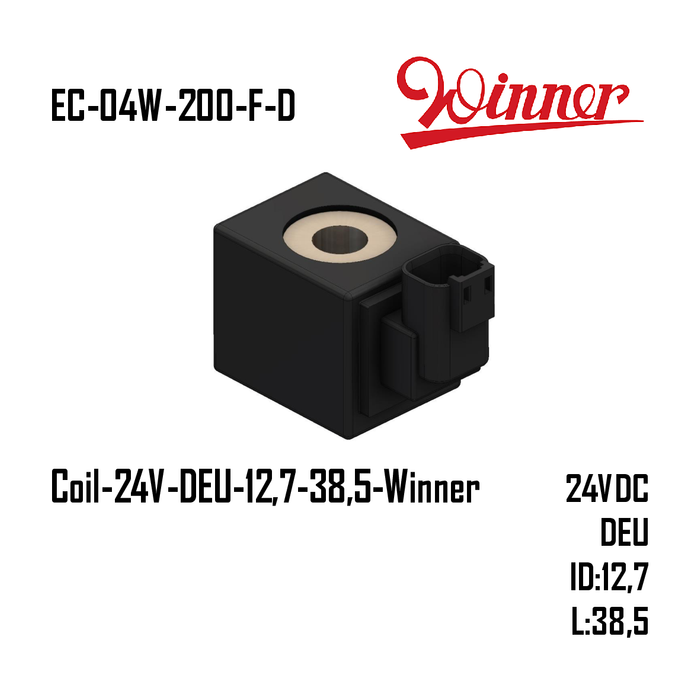 THIS COIL OPERATES AT 24 VDC AND USES A DEUTSCH CONNECTION WITH AN INSIDE DIAMETER OF 12.7 MM AND AN OVERALL LENGTH OF 38.5 MM. BRAND: WINNER.