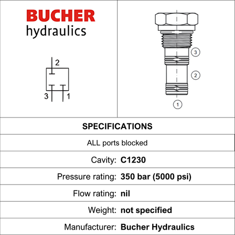 THIS CAVITY PLUG 3-WAY BLOCKS ALL PORTS USES A C-12-30 CAVITY AND OPERATES UP TO 350 BAR. BRAND: BUCHER HYDRAULICS.