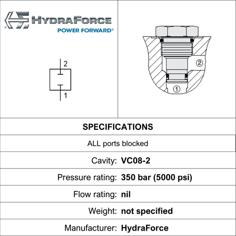 THIS CAVITY PLUG 2-WAY BLOCKS ALL PORTS USES A C-8-2 CAVITY AND OPERATES UP TO 350 BAR. BRAND: HYDRAFORCE.