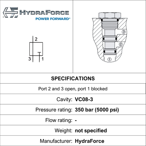 THIS CAVITY PLUG 3-WAY PORT 1 BLOCKED, PORTS 2 & 3 CONNECTED USES A C-8-3 CAVITY AND OPERATES UP TO 350 BAR. BRAND: HYDRAFORCE.