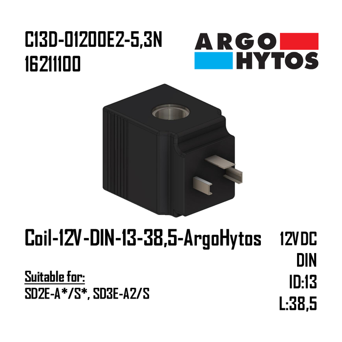 THIS COIL OPERATES AT 12 V AND USES A DIN CONNECTION WITH AN INSIDE DIAMETER OF 13 MM AND AN OVERALL LENGTH OF 38.5 MM. BRAND: ARGO.