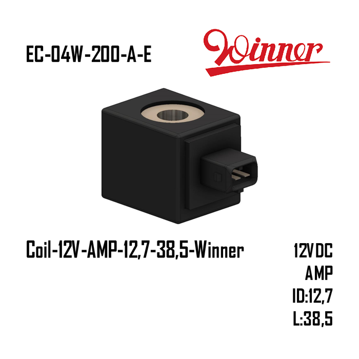 THIS COIL OPERATES AT 12 VDC AND USES A AMP CONNECTION WITH AN INSIDE DIAMETER OF 12.7 MM AND AN OVERALL LENGTH OF 38.5 MM. BRAND: WINNER.