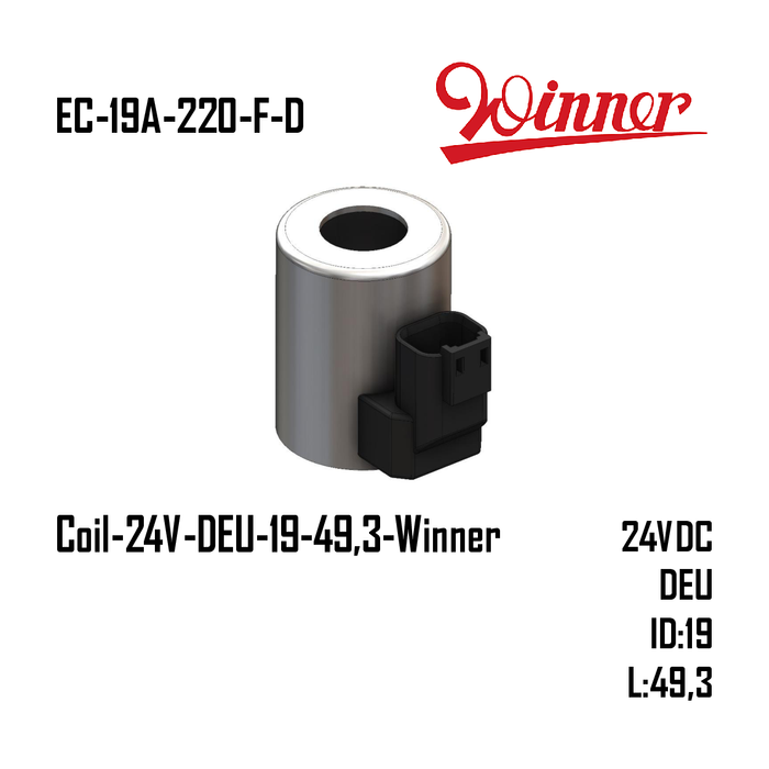 THIS COIL OPERATES AT 24 VDC AND USES A DEUTSCH CONNECTION WITH AN INSIDE DIAMETER OF 19 MM AND AN OVERALL LENGTH OF 49.3 MM. BRAND: WINNER.