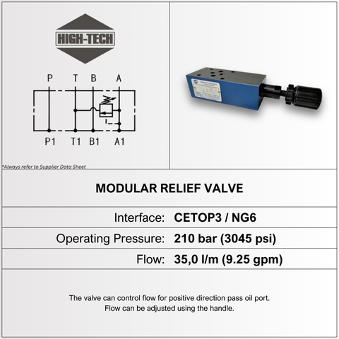 THIS MODULAR RELIEF VALVE FEATURES PORT A CONFIGURATION, CETOP 03 / NG6 SIZE, A MAXIMUM OPERATING PRESSURE OF 210 BAR, AND A FLOW CAPACITY OF 35 L/MIN. BRAND: HIGH-TECH.