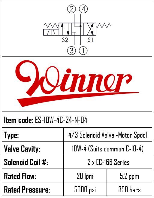 THIS SOLENOID VALVE DIRECT-ACTING, SPOOL TYPE, 4-WAY 3-POSITION FEATURES A C-10-4 CAVITY, OPERATES UP TO 350 BAR, AND PROVIDES A FLOW CAPACITY OF 20 LPM. WHEN BOTH COILS ARE DE-ENERGIZED, PORT 1, PORT 2 AND PORT 4 ARE OPEN TO EACH OTHER WHILE PORT 3 IS BLOCKED. WHEN S1 IS ENERGIZED, IT ALLOWS FLOW FROM PORT 2 TO PORT 1 AND FROM PORT 3 TO PORT 4. WHEN S2 IS ENERGIZED, IT ALLOWS FLOW FROM PORT 3 TO PORT 2 AND FROM PORT 4 TO PORT 1. BRAND: WINNER.