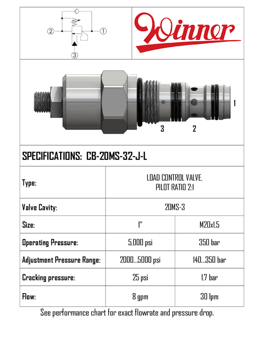 CB20MS32JL • COUNTERBALANCE VALVE LOAD HOLDING 2:1 PILOT • 20MS-3 • 350 BAR (SET 140-350 BAR) • 30 LPM • WINNER