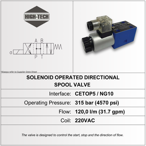 THIS DIRECTIONAL CONTROL VALVE FEATURES A C SPOOL CONFIGURATION, CETOP 05 / NG10 SIZE, A MAXIMUM OPERATING PRESSURE OF 315 BAR AND A FLOW CAPACITY OF 120 L/MIN. BRAND: HIGH-TECH.