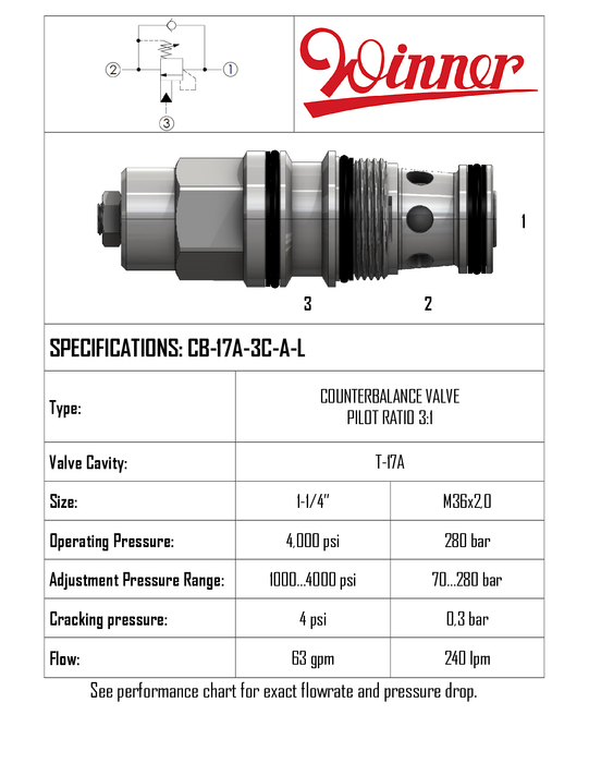 CB17A3CAL • COUNTERBALANCE VALVE 3:1 PILOT RATIO • T-17A • 280 BAR (SET 70-280 BAR) • 240 LPM • WINNER