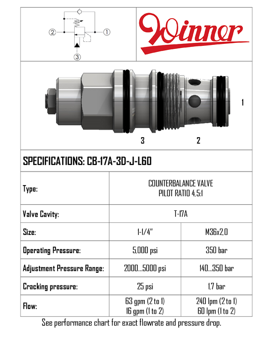CB17A3DJL60 • COUNTERBALANCE VALVE LOAD HOLDING 4.5:1 PILOT • T17A • 350 BAR (SET 140-350 BAR) • 240 LPM • WINNER