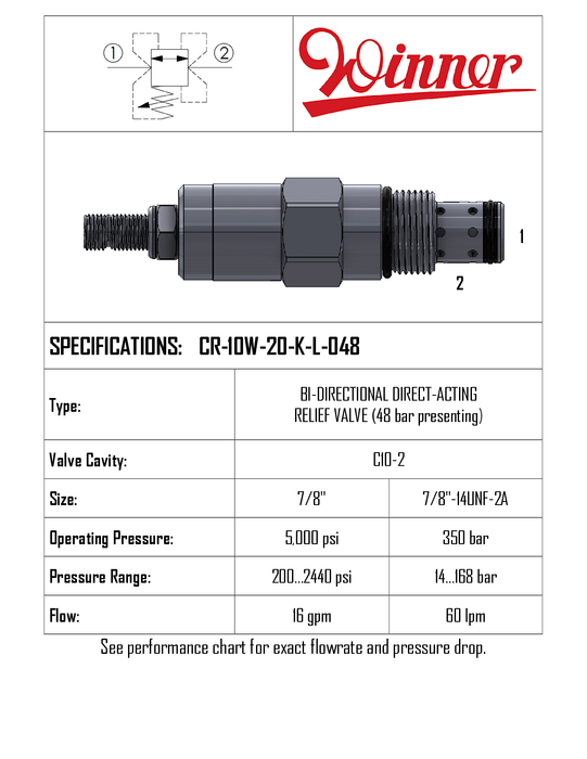 CR10W20KL-048 • RELIEF VALVE • BI-DIRECTIONAL • DIRECT ACTING • C-10-2 • 350 BAR (SET 14–168 BAR, PRESET 48 BAR) • 60 L/MIN • WINNER HYDRAULICS