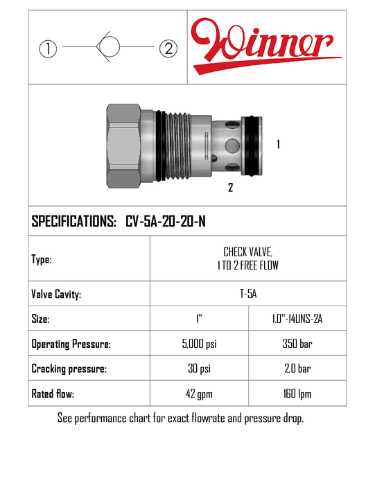 CV5A2020N • CHECK VALVE 1 TO 2 FREE FLOW • 2.0 BAR • T-5A • 350 BAR • 160 LPM • WINNER
