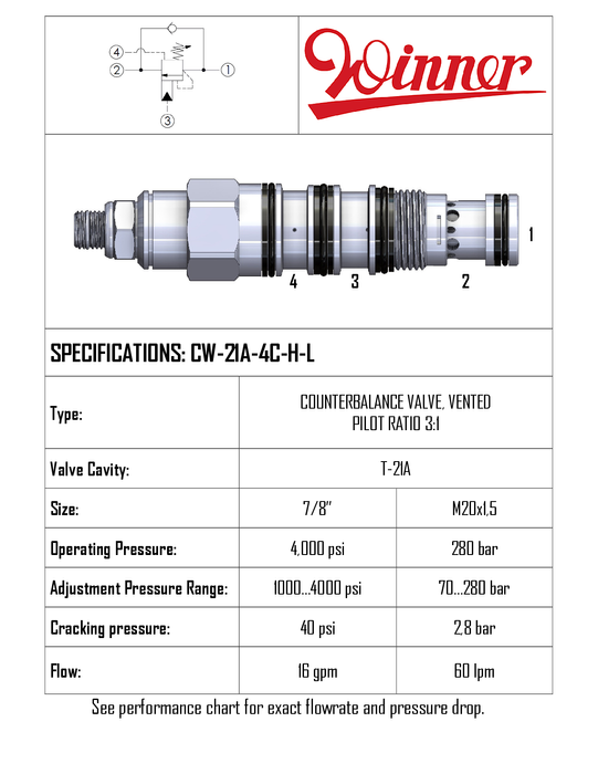 CW21A4CHL • COUNTERBALANCE VALVE LOAD HOLDING 3:1 PILOT• T-21A • 280 BAR (70-280 BAR) • 60 LPM • WINNER