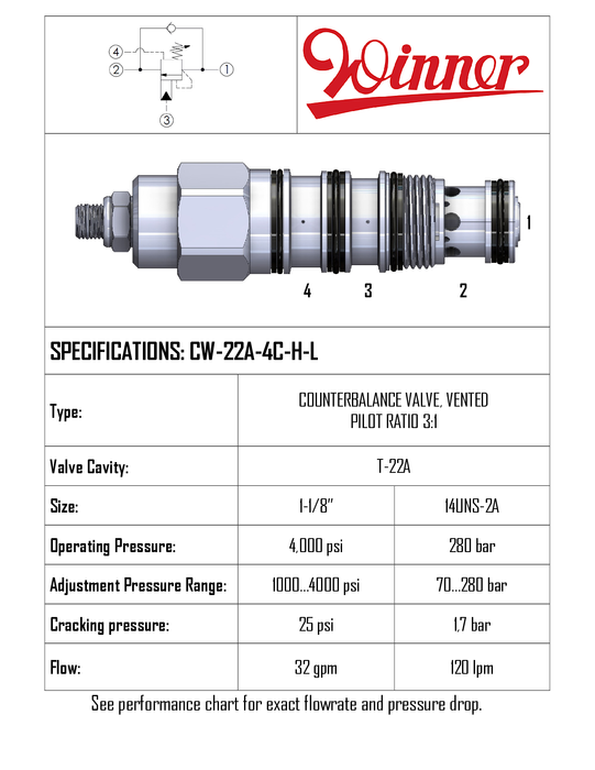 CW22A4CHL • COUNTERBALANCE VALVE LOAD HOLDING 3:1 PILOT• T-22A • 280 BAR (70-280 BAR) • 120 LPM • WINNER
