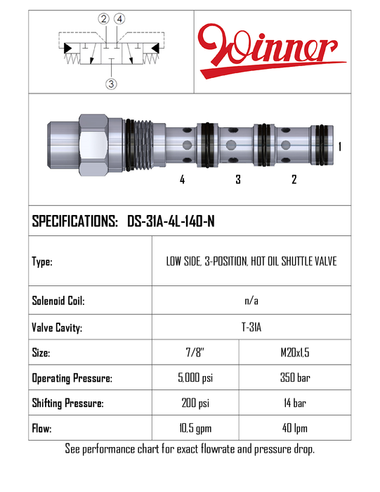 THIS LOW-SIDE HOT OIL SHUTTLE VALVE FEATURES A THREE-POSITION CONFIGURATION WITH 4 PORTS. IT OPERATES AT PRESSURES UP TO 350 BAR AND HANDLES FLOWS OF 40 LPM. CAVITY T-31A. BRAND: WINNER.