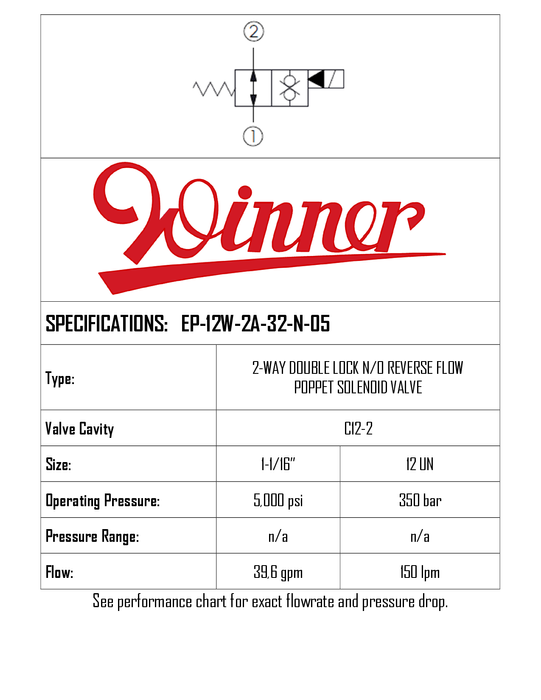 EP12W2A32N05 • SOLENOID VALVE POPPET DOUBLE LOCK NORMALLY OPEN • C-12-2 • 350 BAR • 150 LPM • WINNER