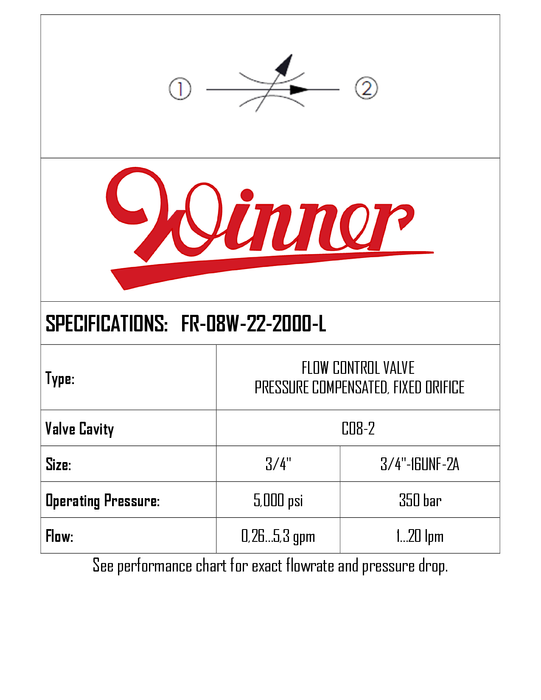 FR08W222000L • FLOW CONTROL VALVE, PRESSURE COMPENSATED, FIXED ORIFICE • C-8-2 • 350 BAR • 20 LPM • WINNER