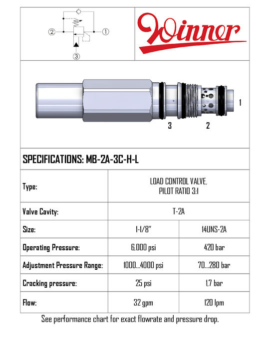 MB2A3CHL • COUNTERBALANCE VALVE 3:1 PILOT RATIO • T-2A • 420 BAR (SET 70-280 BAR) • 120 LPM • WINNER