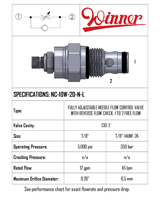 NC10W20NL • FLOW CONTROL NEEDLE VALVE, WITH REVERSE FLOW CHECK • C-10-2 • 350 BAR • 45 LPM • WINNER