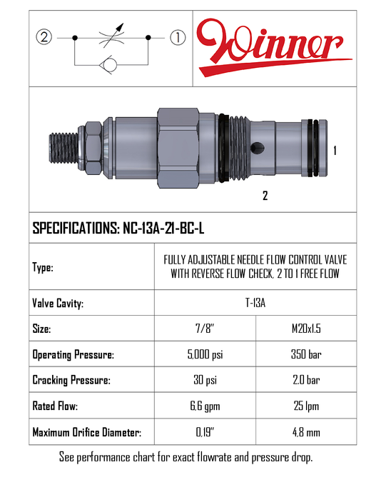 THIS ADJUSTABLE NEEDLE VALVE WITH REVERSE FLOW CHECK AND SHARP-EDGE ORIFICE USES A T-13A CAVITY, OPERATES TO 350 BAR, AND FLOWS 25 LPM. BRAND: WINNER HYDRAULICS.
