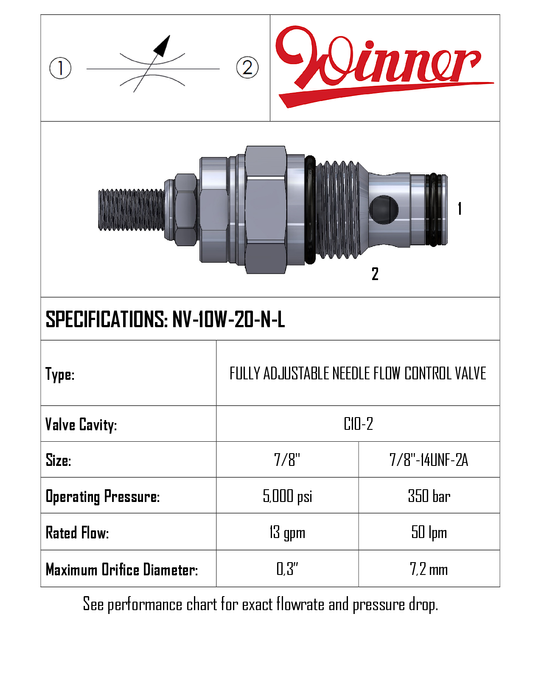 THIS ADJUSTABLE NEEDLE FLOW CONTROL USES A C-10-2 CAVITY, OPERATES TO 350 BAR, AND FLOWS 50 LPM. BRAND: WINNER HYDRAULICS.