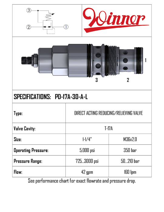 DETAILS: M36×2.0 THREAD CAVITY (T-17A) • DIRECT ACTING PRESSURE REDUCING AND RELIEVING VALVE • FLOW 160 L/MIN • MAX PRESSURE 350 BAR • PRESSURE SET RANGE 50–210 BAR (STANDARD SETTING 70 BAR) • ADJUSTMENT TYPE L = LEAKPROOF HEX SOCKET SCREW • WEIGHT 0.70 KG • INSTALLATION TORQUE 200–215 NM • MAX LEAKAGE 65 CC/MIN @ 70 BAR • MATERIAL: STEEL BODY, ZINC-PLATED • FUNCTION: REDUCES PRESSURE PORT 2?1 WITH RELIEVING TO PORT 3 • BRAND: WINNER HYDRAULICS