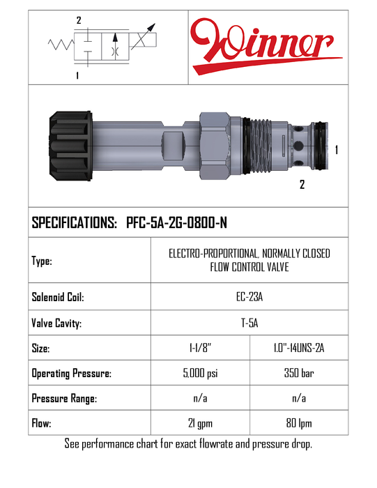PFC5A2G0800N • ELECTRO-PROPORTIONAL FLOW CONTROL VALVE NORMALLY CLOSED THROTTLE • T-5A • 350 BAR • 80 LPM • WINNER