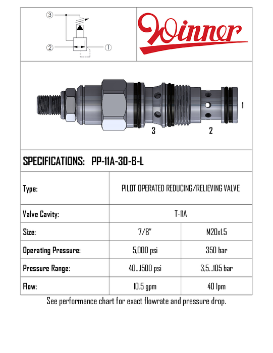 PP11A30BL • PRESSURE REDUCING/RELIEVING VALVE PILOT OPERATED • T-11A • 350 BAR (7–210 BAR) • 40 LPM • WINNER