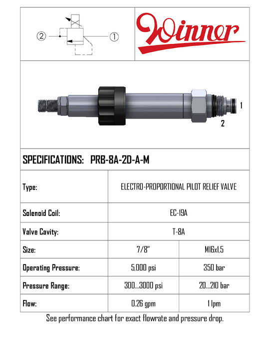 THIS PROPORTIONAL PILOT RELIEF VALVE FEATURES ELECTRO-PROPORTIONAL PILOT CONTROL, USES A T-8A CAVITY, 20–210 BAR RANGE, AND 1 LPM FLOW. BRAND: WINNER.