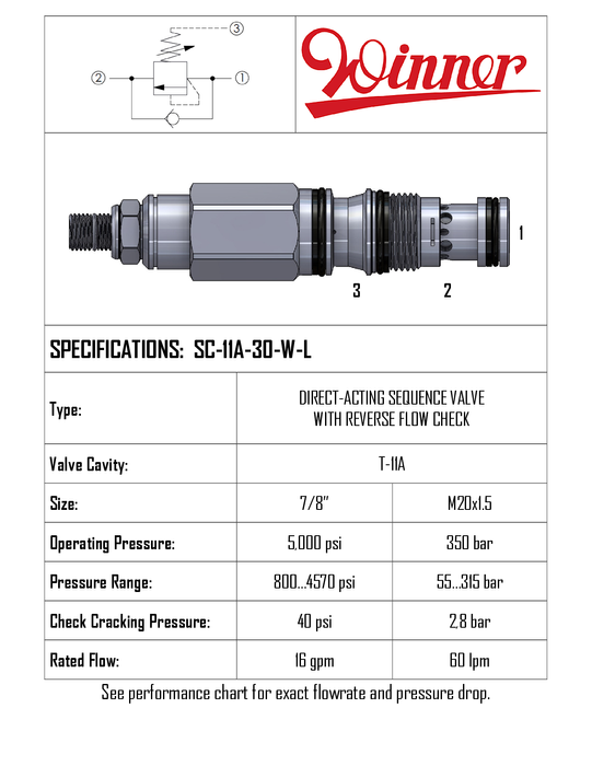SC11A30WL • PRESSURE SEQUENCE VALVE DIRECT ACTING WITH REVERSE FLOW CHECK • T-11A • 350 BAR (55–315 BAR) • 60 LPM • WINNER