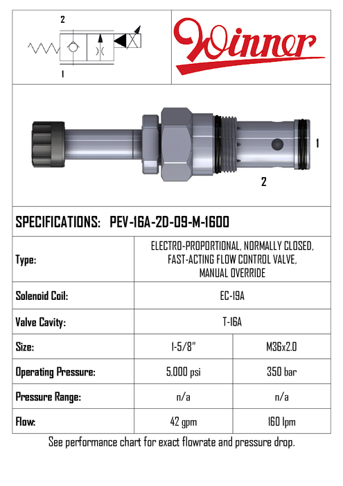 PEV16A2D09M1600 • ELECTRO-PROPORTIONAL FLOW CONTROL VALVE PRESSURE COMPENSATED • T-16A • 350 BAR • 240 LPM (0–160 LPM) • WINNER