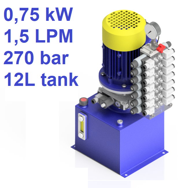 THIS HYDRAULIC POWER UNIT OPERATES WITH 0.75 KW MOTOR AT 240 V AC. DESIGNED FOR 270 BAR AND 1.5 L/MIN. INCLUDES 12 L TANK AND PMC 30 VALVE INTERFACE. BRAND: PRIMEHYD