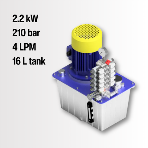 THIS HYDRAULIC POWER UNIT OPERATES WITH 2.2 KW MOTOR AT 415 V AC. DESIGNED FOR 300 BAR AND 4 L/MIN. INCLUDES 16 L TANK AND PMC 30 VALVE INTERFACE. BRAND: PRIMEHYD
