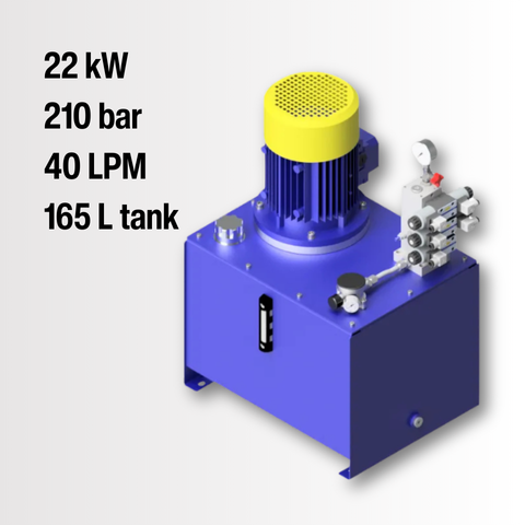THIS HYDRAULIC POWER UNIT OPERATES WITH 22.0 KW MOTOR AT 415 V AC. DESIGNED FOR 270 BAR AND 40 L/MIN. INCLUDES 165 L TANK AND CETOP 5 VALVE INTERFACE. BRAND: PRIMEHYD