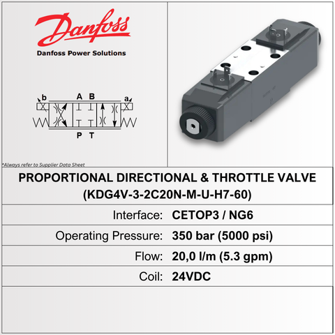 DANFOSS PROPORTIONAL DIRECTIONAL VALVE KDG4V-3S-2C13N-MUH5-60, CETOP 03 (ISO 4401-03), MAX PRESSURE 350 BAR (5000 PSI), RATED FLOW 19 L/MIN (5 GPM), 24 V DC COIL, BRAND: DANFOSS