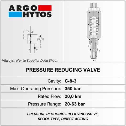 THIS DIRECT ACTING SPOOL PRESSURE REDUCING/RELIEVING VALVE USES A C-8-3 CAVITY, OPERATES UP TO 350 BAR (20–63 BAR), AND FLOWS 20 LPM. BRAND: ARGO HYTOS.