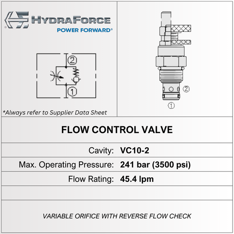 THIS VARIABLE ORIFICE FLOW CONTROL WITH REVERSE CHECK USES A VC10-2 CAVITY, OPERATES TO 241 BAR, AND FLOWS 45.5 LPM. BRAND: HYDRAFORCE.