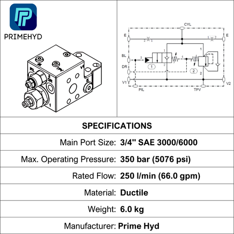 THIS CHECK & METERING CARTRIDGE FEATURES G 1/4"-19 × 3 AND G 1/8"-28 × 2 AND 3/4" SAE 3000 / G 1/2"-14 × 1 AND 3/4" SAE 3000/6000 × 1 CONNECTIONS WITH A PRESSURE RATING OF 350 BAR AND A FLOW CAPACITY OF 250 LPM. BRAND PRIMEHYD.