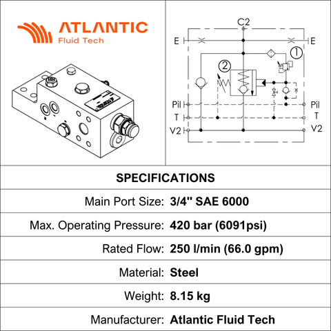 THIS CHECK & METERING VALVE ISO8643 FEATURES G 3/4" × 2 AND G 1/4" × 3 CONNECTIONS WITH A PRESSURE RATING OF 420 BAR AND A FLOW CAPACITY OF 250 LPM. BRAND AFT.