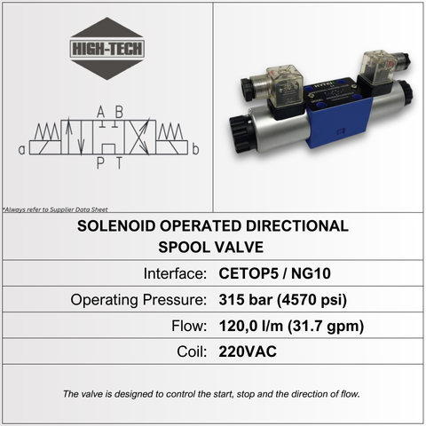 THIS DIRECTIONAL CONTROL VALVE FEATURES A G SPOOL CONFIGURATION, CETOP 05 / NG10 SIZE, A MAXIMUM OPERATING PRESSURE OF 315 BAR AND A FLOW CAPACITY OF 120 L/MIN. BRAND: HIGH-TECH.