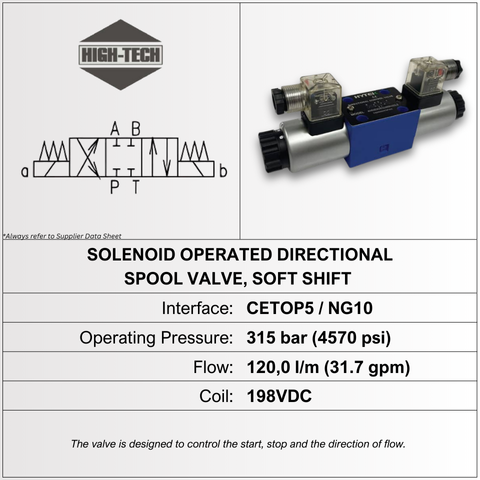 THIS SOLENOID OPERATED DIRECTIONAL CONTROL VALVE FEATURES A SPOOL E DESIGN, CETOP 05 / NG10 SIZE, A MAXIMUM OPERATING PRESSURE OF 315 BAR, AND A FLOW CAPACITY OF 120 L/MIN. BRAND: HIGH-TECH.