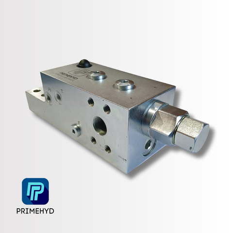 THIS CHECK & METERING VALVE ISO8643 FEATURES 1" SAE 6000 × 1 AND 1" SAE 3000/6000 × 1 AND G 1/4" × 3 CONNECTIONS WITH A PRESSURE RATING OF 420 BAR AND A FLOW CAPACITY OF 400 LPM. BRAND PRIMEHYD.